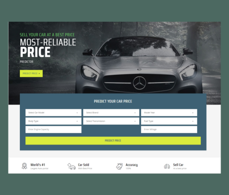 Car Price Prediction The Purpose of this project is to develop reliable and accurate car price prediction model. The dataset scrapped from internet utilizes a comprehensive range of features such as automobile make, model, year, mileage, fuel type, engine size, and many more. Neural network model is used to predict the price. Frontend interface developed using ReactJS and used Python fastapi for developing RestApi. Price Predictor.